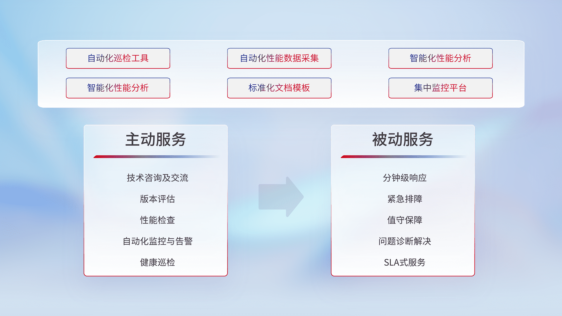 智能化工具和标准化文档,,,保障服务质量,,提供主动服务(包含技术咨询、、、版本评估、、性能检查、、自动化监控与告警、、、健康巡检)和被动服务包含(分钟级响应、、、、紧急排障、、值守保障、、、问题诊断解决、、SLA服务)。。。